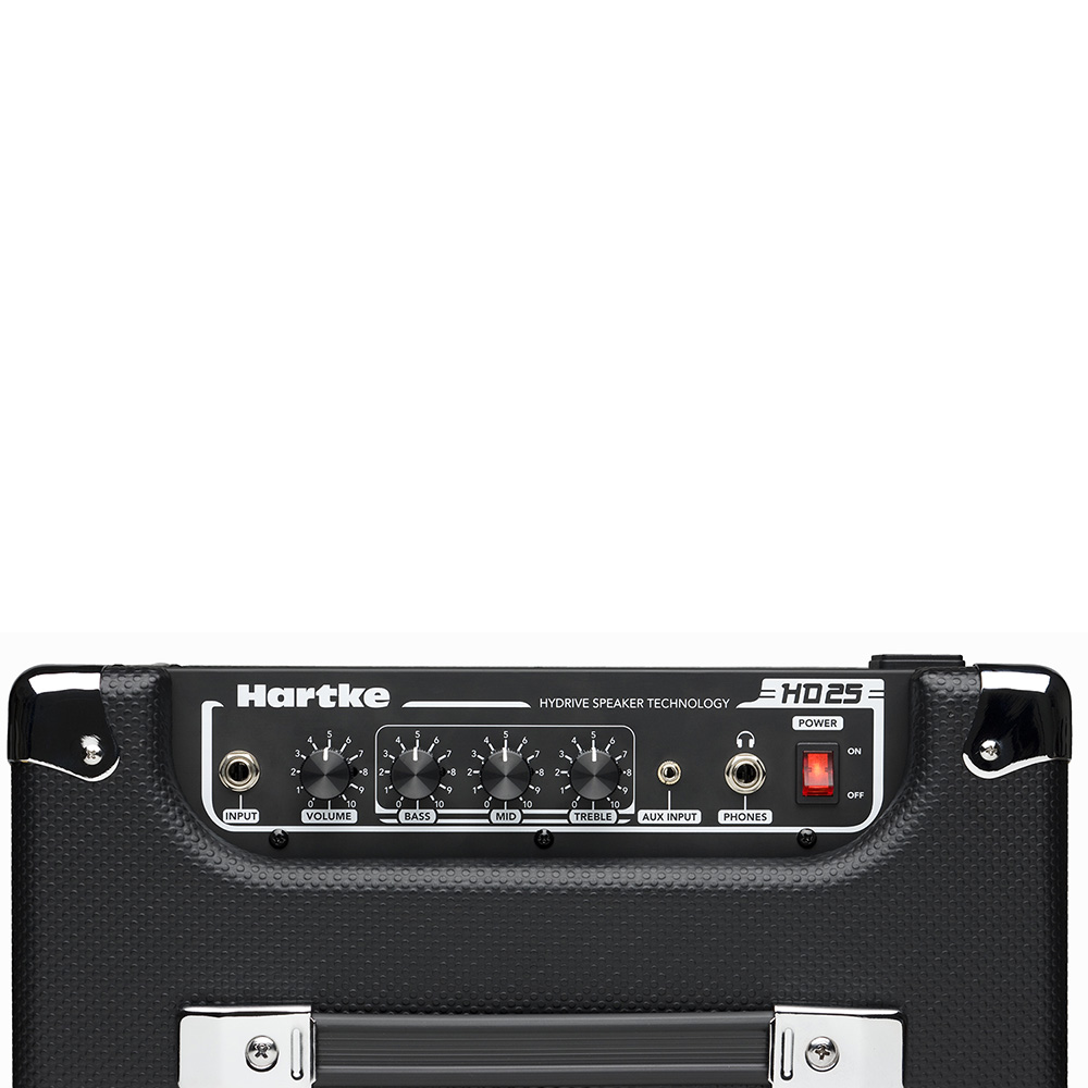 Os falantes HyDrive do HD25 (25W, falante de 8″) são desenvolvidos seguindo a patente da Hartke e fabricados em alumínio e papelão, combinando o grave e o “som quente” do papelão com o ataque e o brilho do alumínio. Os falantes HyDrive produzem o som perfeito para qualquer estilo musical.